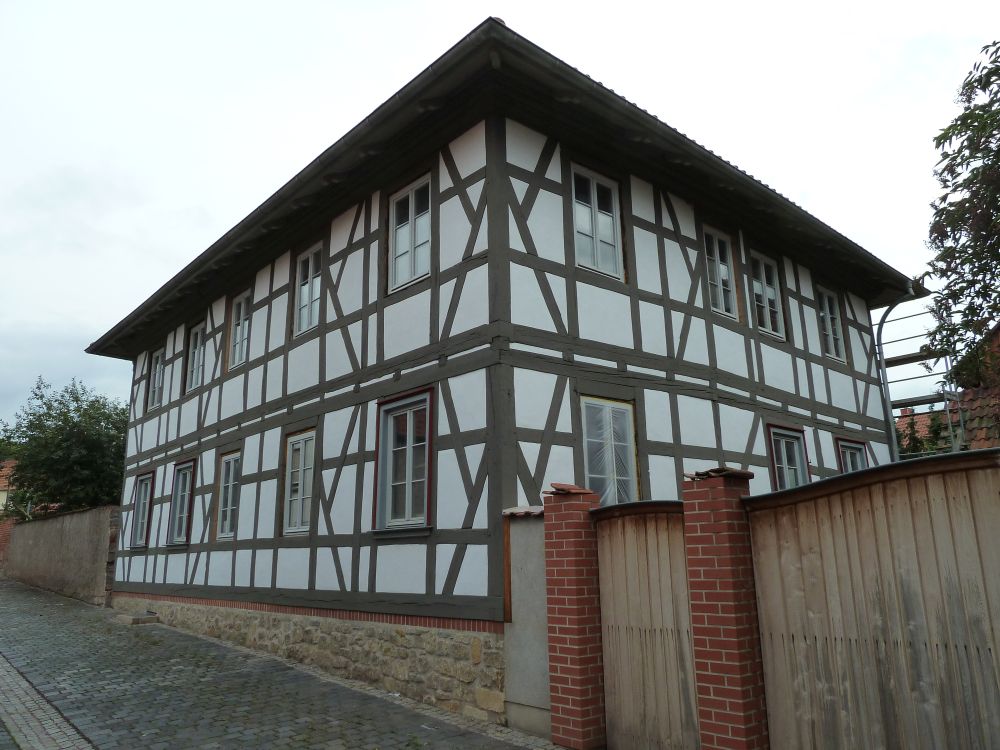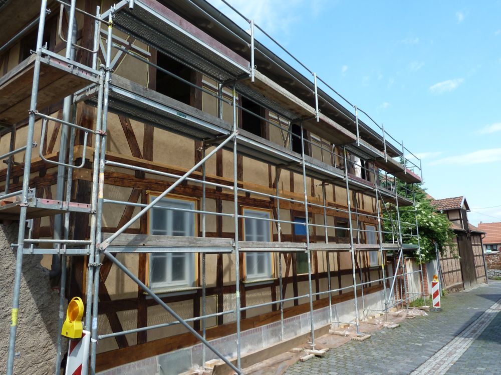 Die Gefache wurden mit Lehmziegeln ausgemauert und mit Lehmputz verputzt. Als Oberputz im Außenbereich wurde ein Kalkputz aufgetragen, der abschließend in feuchtem Zustand zur besseren Haltbarkeit in Frescotechnik gekalkt wurde.