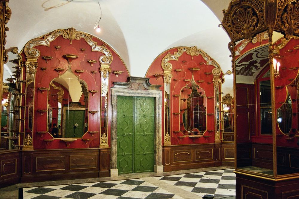 Die Restaurierung des Emaillenzimmers im Grünen Gewölbe (1723 und 1730) im Dresdner Schloss erfolgte im Zeitraum von fast zwei Jahren in Zusammenarbeit mit einem Restauratorenteam unter Leitung von Dipl. Restauratorin Susanne Launer. Etwa die Hälfte der Zeit nahm dabei die aufwändige Freilegung der originalen Zinnoberfassung der Raumausstattung aus der Zeit Augusts des Starken in Anspruch. Anschließend erfolgten: Kittung, Retusche und Neufassung, Öl- und Polimentvergoldung von Originalteilen und Rekonstruktionen, Patinierung von Neufassungen und Vergoldungen und Schlussfirnis.