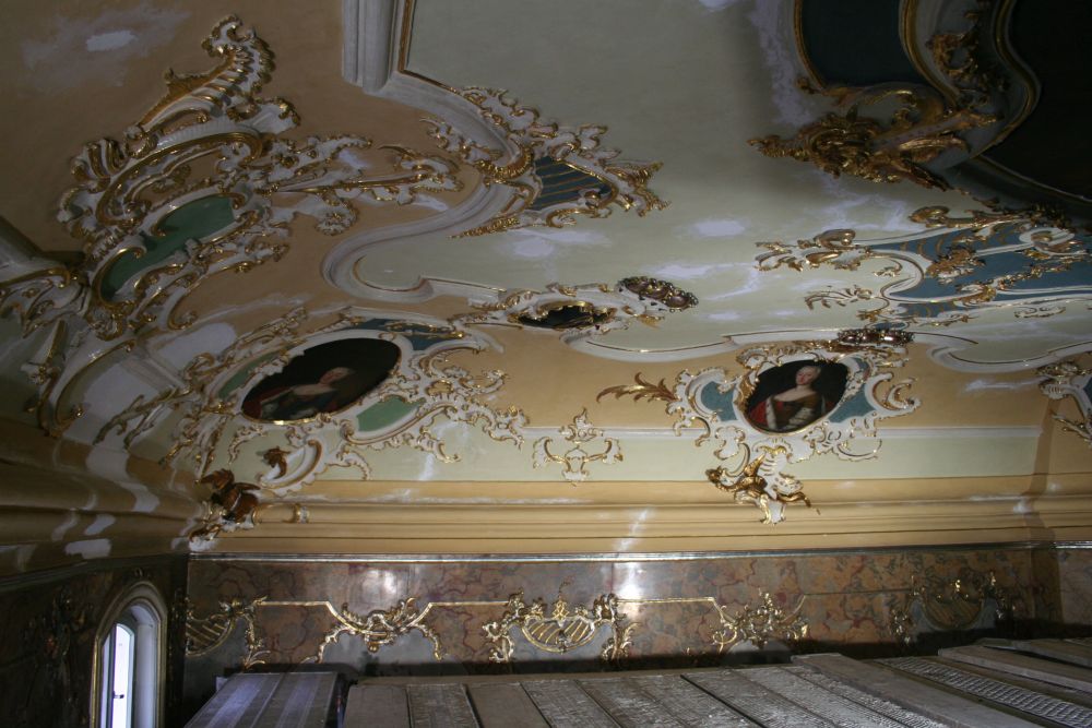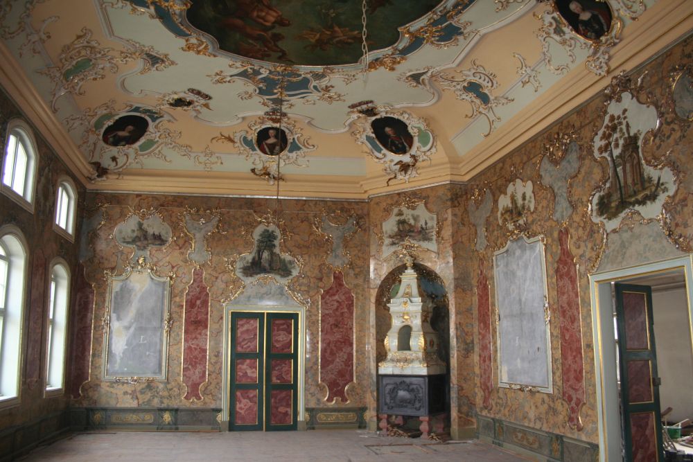 Das Stadtschloss in Eisenach entstand ab 1742 in mehreren Bauphasen unter Herzog Ernst August von Sachsen-Weimar-Eisenach. Der aufwendige Stuckmarmor an den Wänden wurde bei der Restaurierung gereinigt, ebenso die Decke. Fehlstellen in Fassung, Stuck, den Vergoldungen und Polierweißfassungen wurden ergänzt.